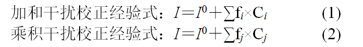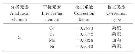 由于原子发射谱线极为复杂,标准样品中的共存元素将会影响分析谱线的强度,完善和扩展曲线所用的中低合金钢和硅钢标准物质在冶炼工艺上不尽相同,共存元素的影响也有所区别,试验表明元素Co、Cr、Mo、Ni对Si存在干扰,因此必须对共存元素间的干扰进行校正。校正一般遵从如下原则:当被测元素谱线与第三元素的谱线非常接近,发生重叠时会产生加和干扰,需要通过公式(1)进行校正;当干扰元素含量较高时,产生乘积干扰,需要通过公式(2)进行校正。