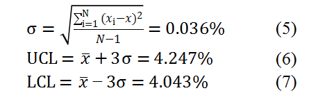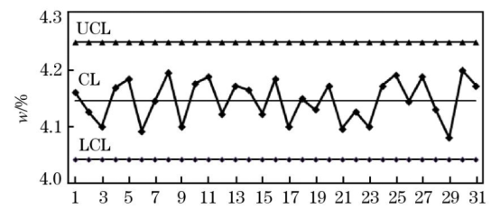 在应用控制图进行统计分析时,通过对检验过程进行分析评价,及时发现系统性因素出现的征兆,并采取措施消除其影响。选用标准样品GBW01389(w(Si)=4.16%)连续分析31天,利用31组数据绘制均值控制图,其中标准差(σ)、上控制限(UCL)、下控制限(LCL)计算过程见式(5)~(7),并做均值控制图,期间未对曲线进行标准化工作。所绘制的均值控制图如图2所示。