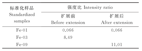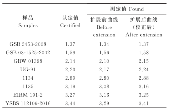 式中:I为标准强度比(在初始标准化期间确定);I′为测量强度比;a为平移修正因数;b为斜率修正因数。校准曲线扩展前后所用标准化样品强度比见表4。强度比由9.41扩展至11.01。
