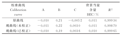 校准曲线经拟合后曲线常数、背景当量含量、线性相关系数(R2)见表3。