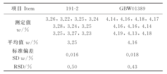 从表6可以看出,w(Si)≥3.0%时,Si测定结果的相对标准偏差(RSD)均小于1.0%,说明分析结果间的一致性较好,精密度较高。